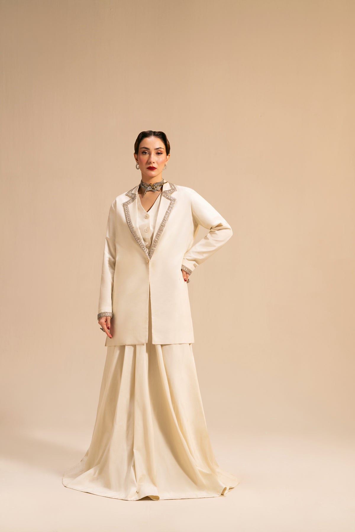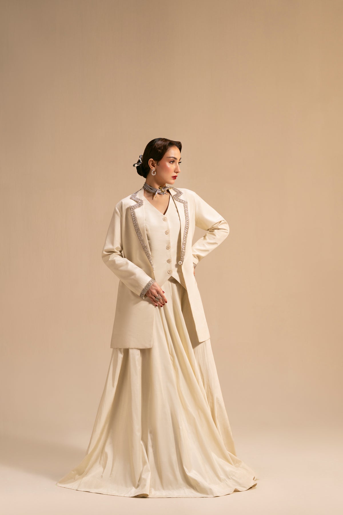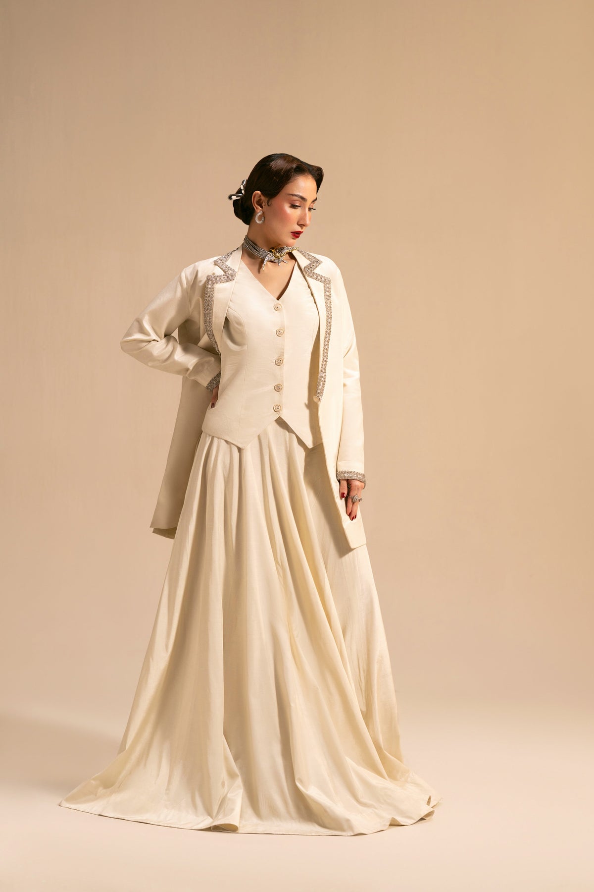This refined ivory ensemble features a long, flowing ivory skirt paired with a tailored waistcoat and an over-jacket. The jacket is highlighted with delicate silver embellishment tracing the lapel in a soft zig-zag pattern, adding just the right amount of shimmer without overpowering the look.
