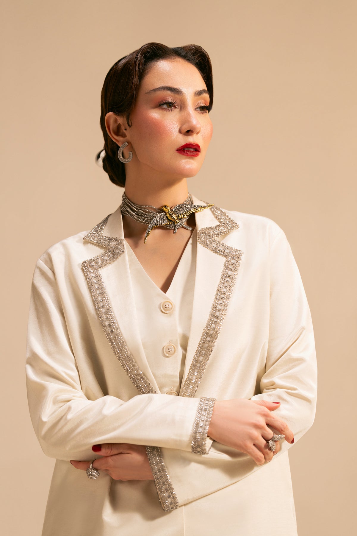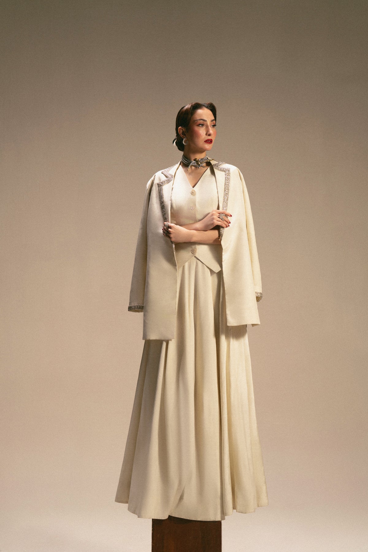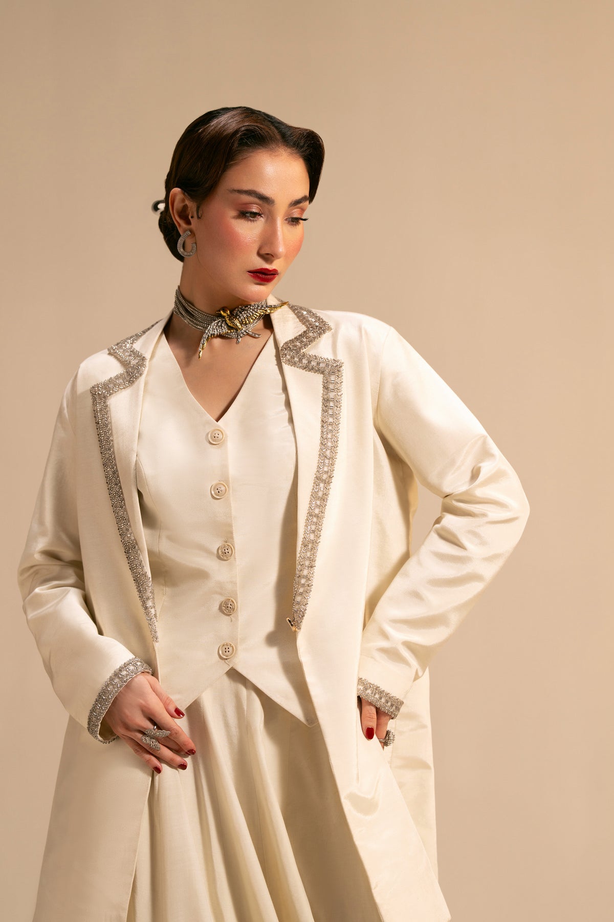 This refined ivory ensemble features a long, flowing ivory skirt paired with a tailored waistcoat and an over-jacket. The jacket is highlighted with delicate silver embellishment tracing the lapel in a soft zig-zag pattern, adding just the right amount of shimmer without overpowering the look.
