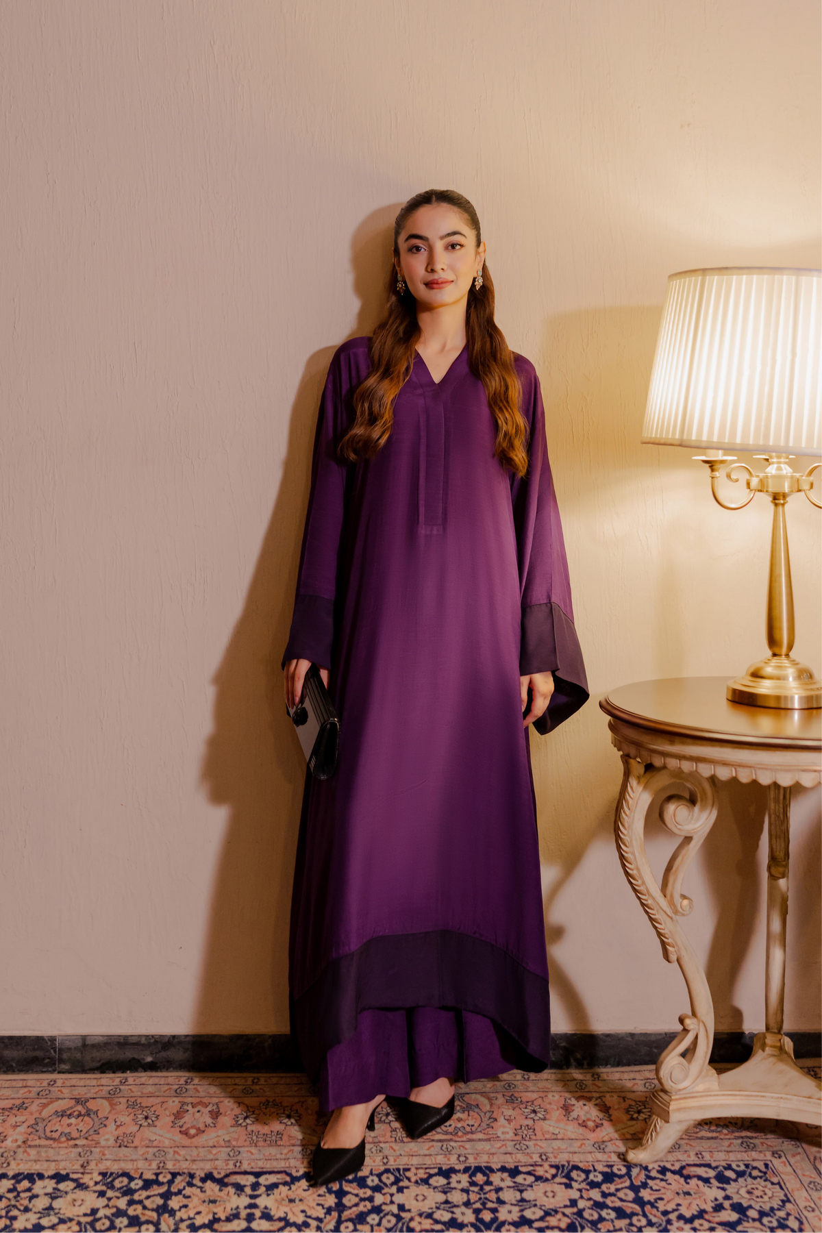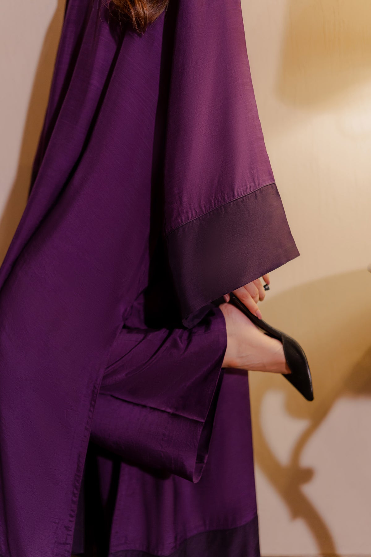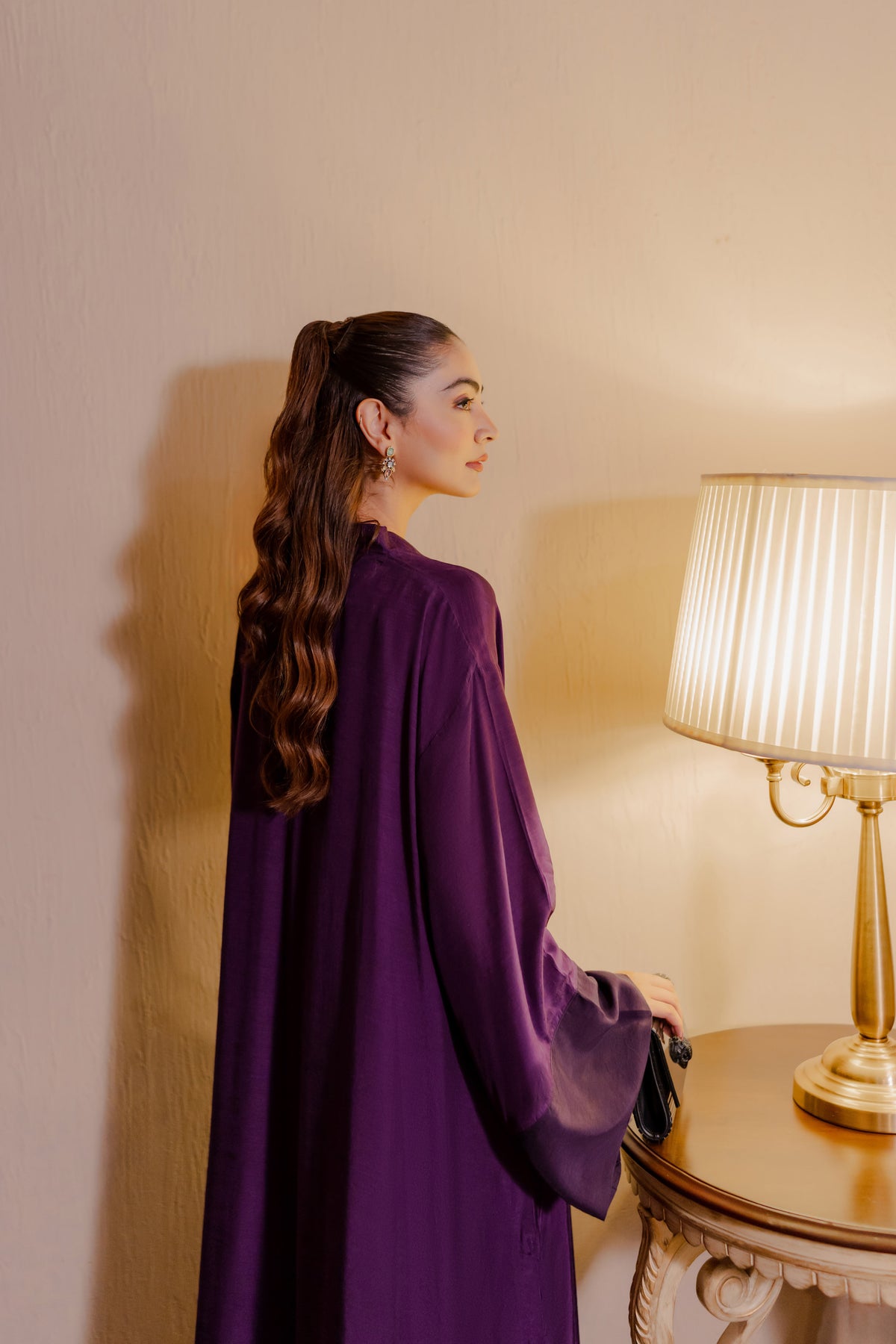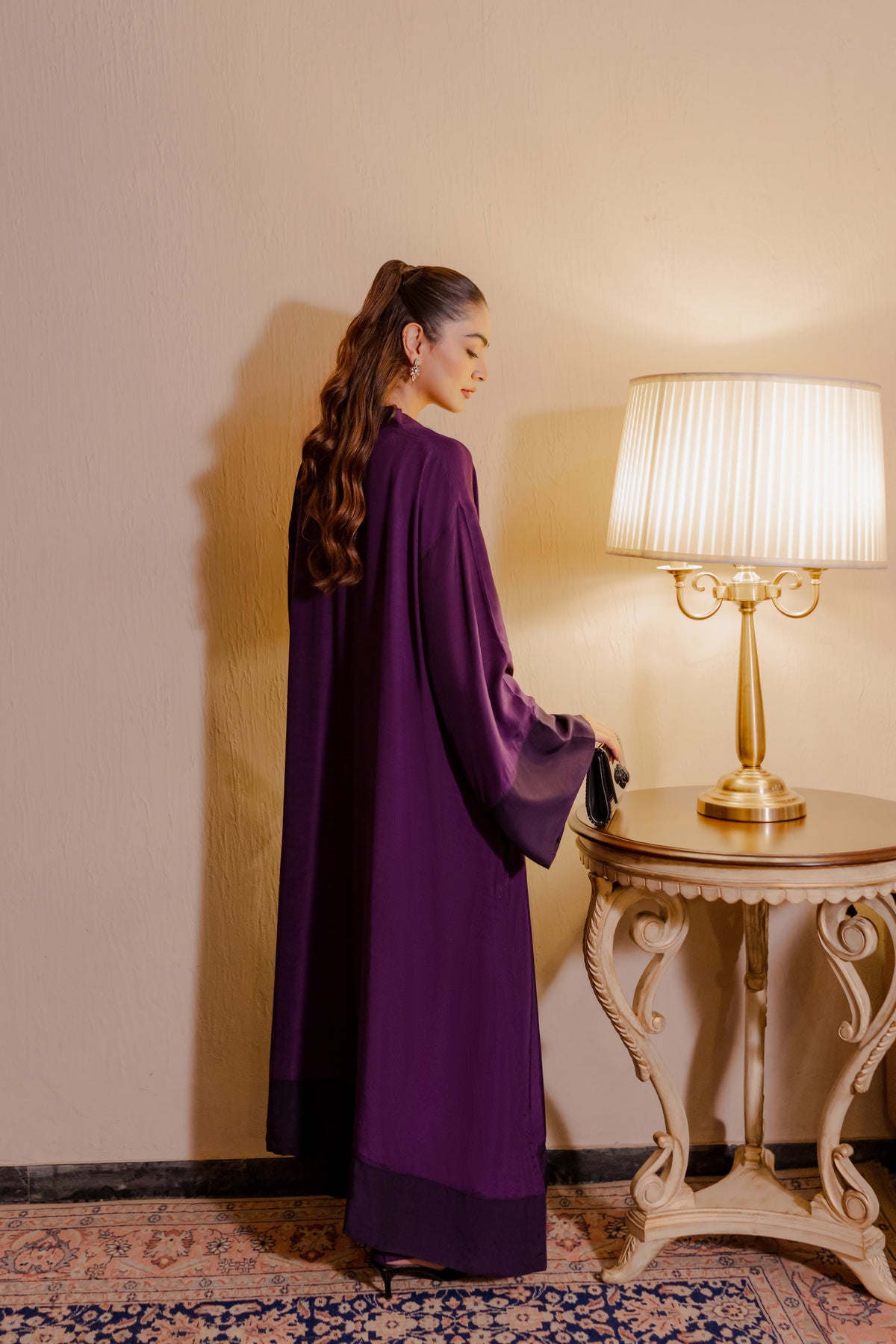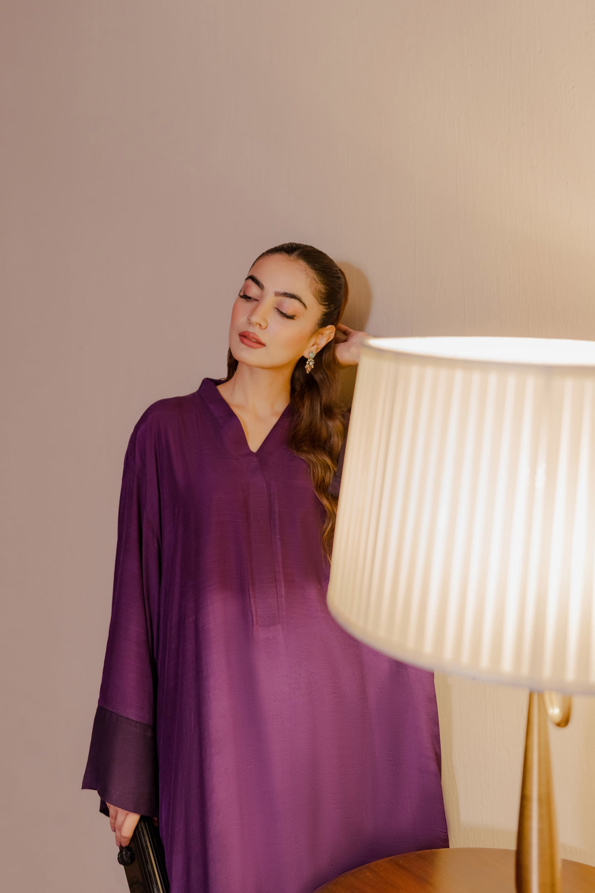 This hot pink kaftan-style dress features a relaxed, flowing silhouette with a straight, floor-length cut that drapes gracefully. It has a clean V-neckline that adds a subtle feminine touch while keeping the look modest.The sleeves are crafted in a wide bell-cut style finished with tonal borders, adding soft detail to the minimalist design.