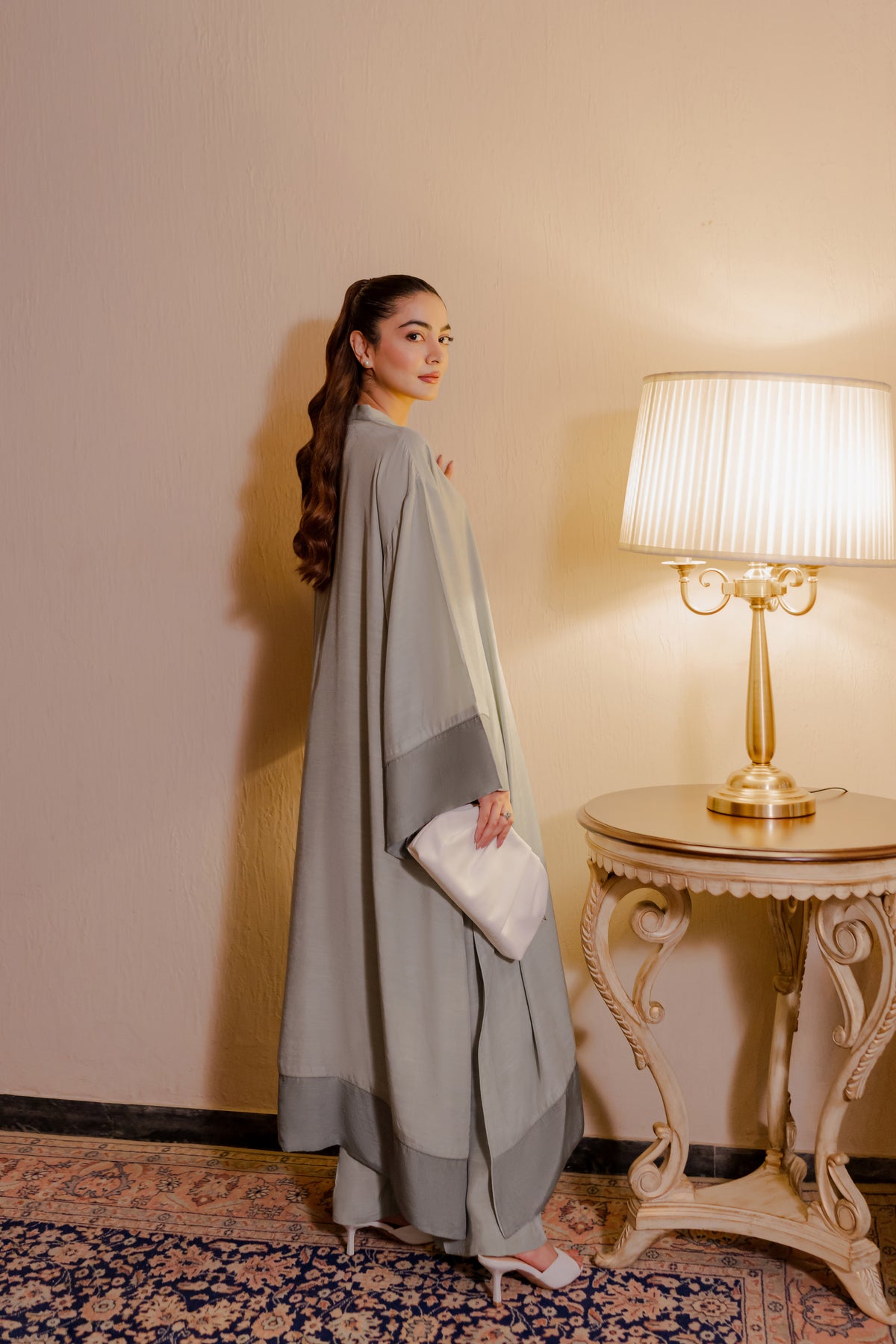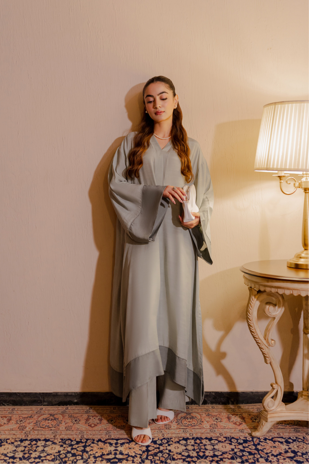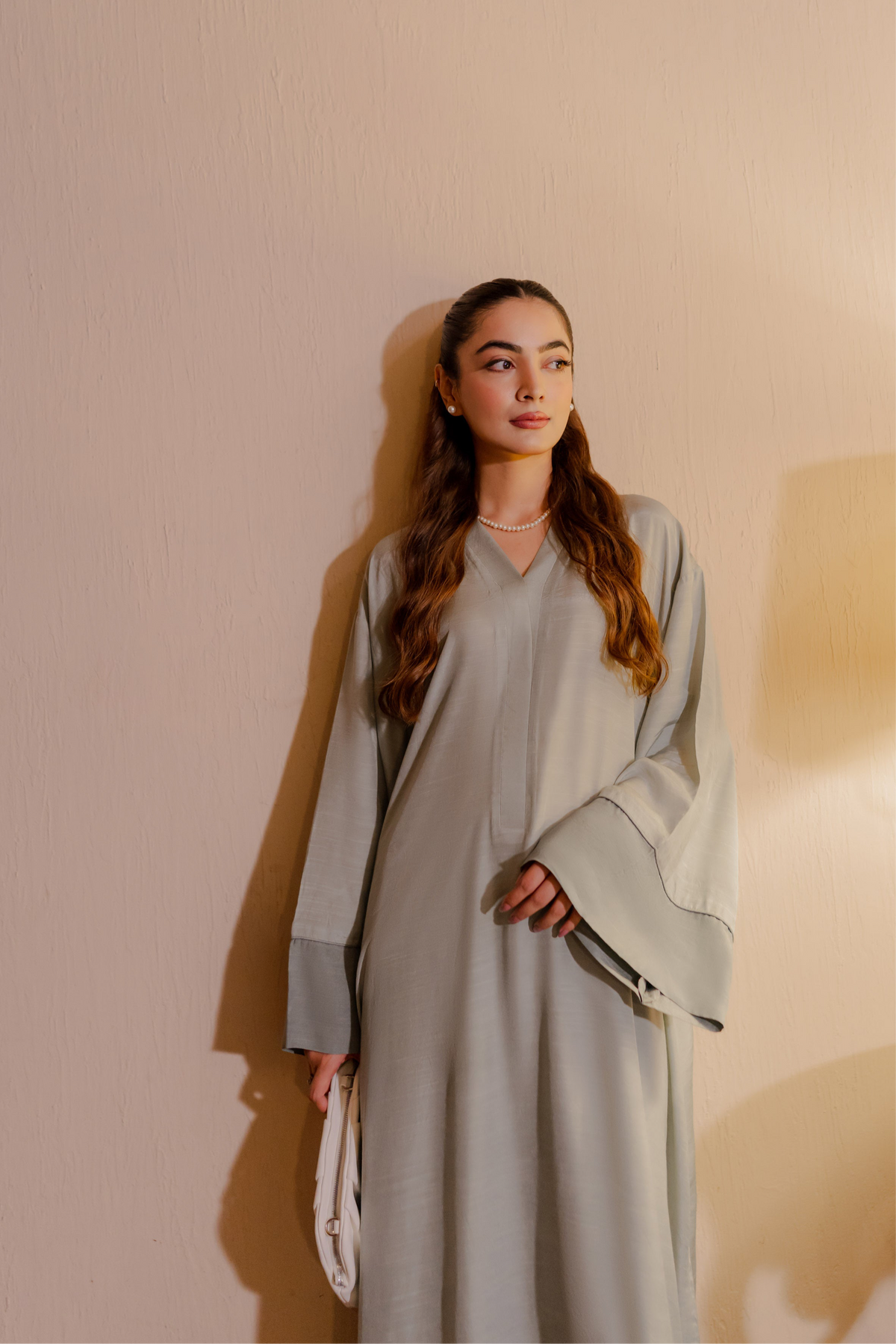 This hot pink kaftan-style dress features a relaxed, flowing silhouette with a straight, floor-length cut that drapes gracefully. It has a clean V-neckline that adds a subtle feminine touch while keeping the look modest.The sleeves are crafted in a wide bell-cut style finished with tonal borders, adding soft detail to the minimalist design.