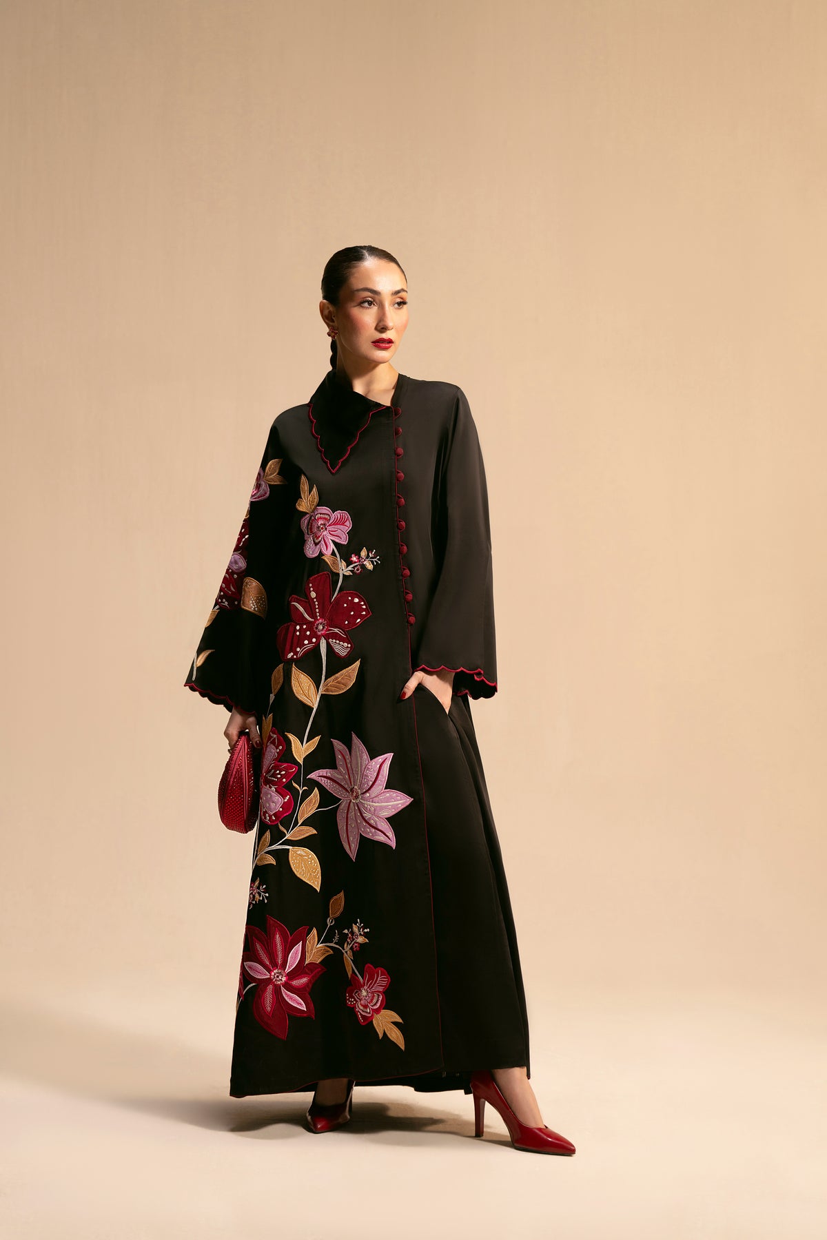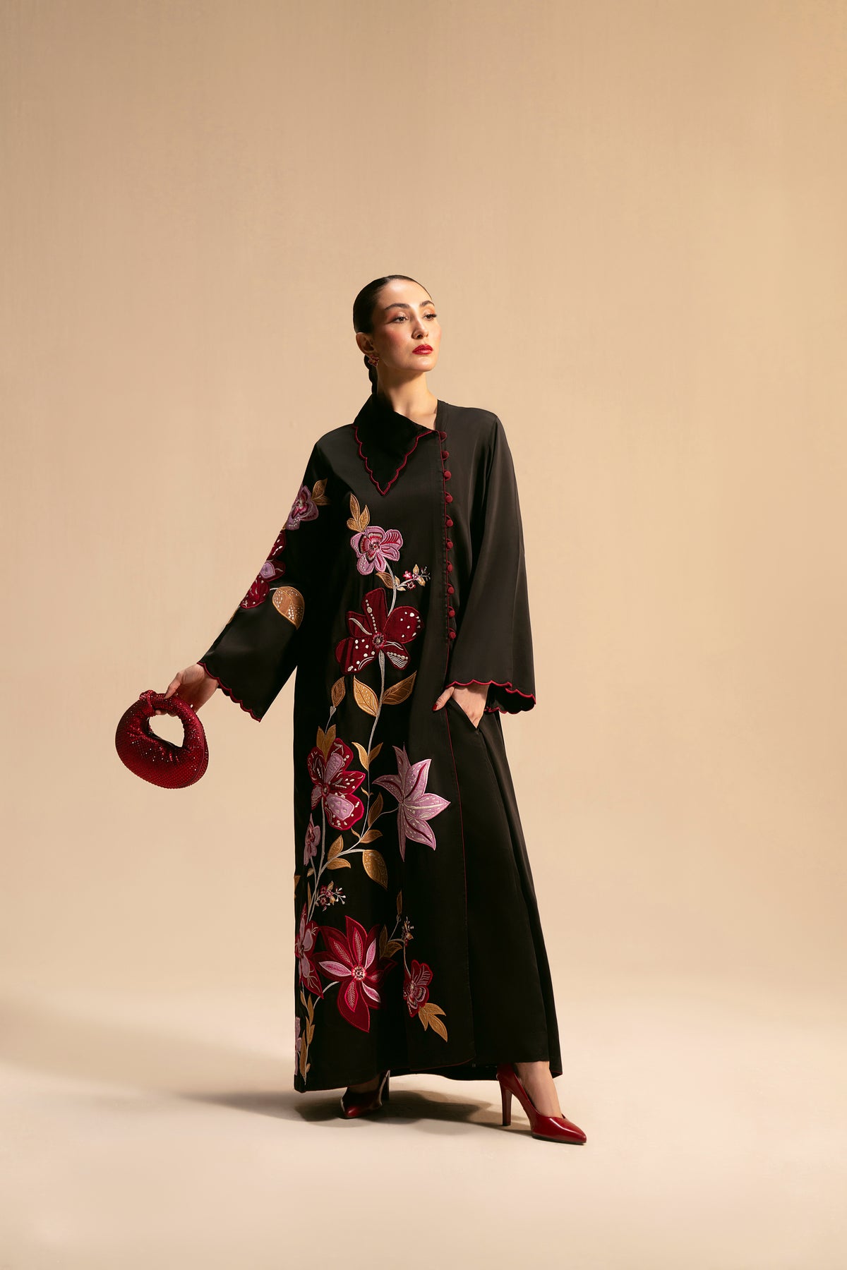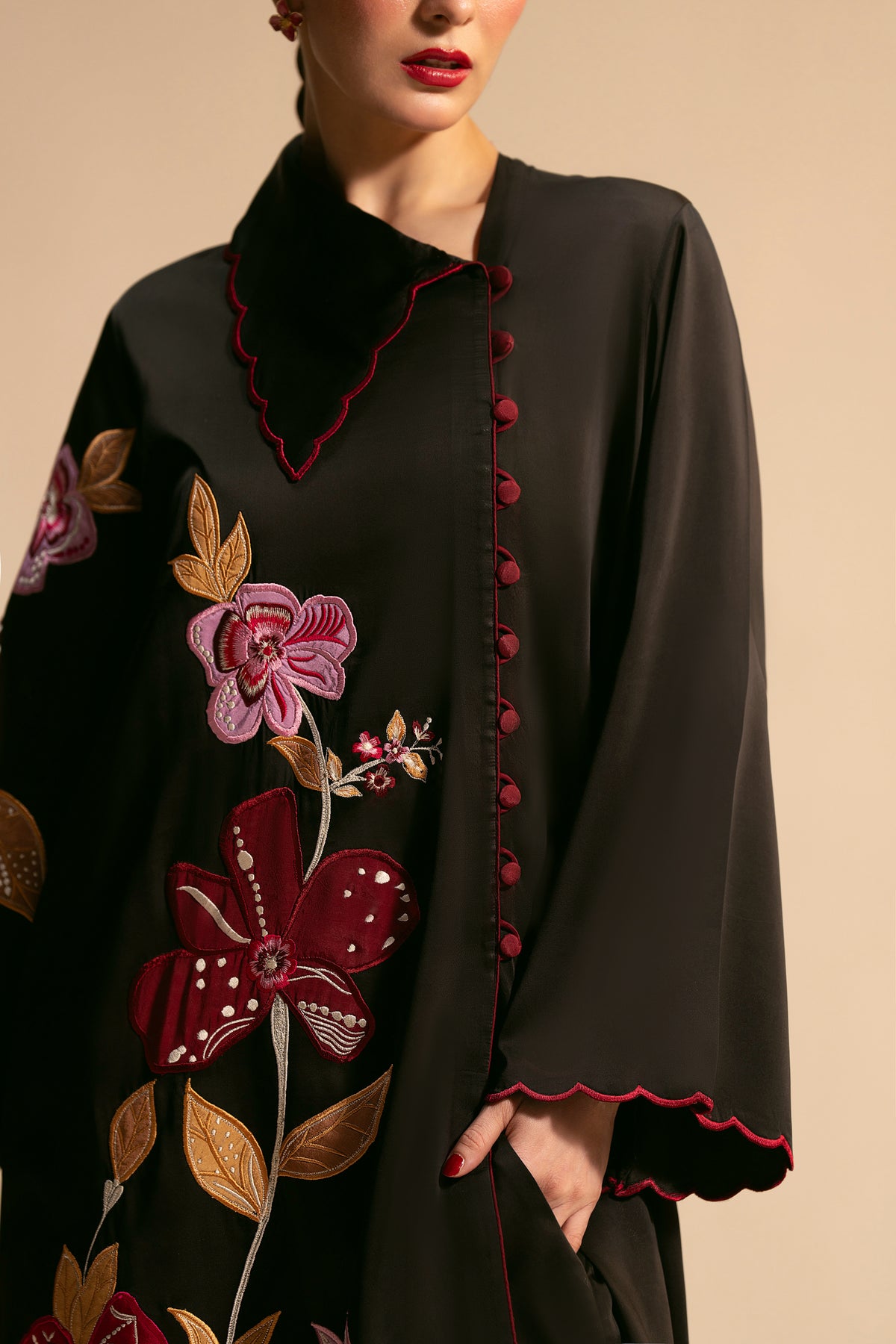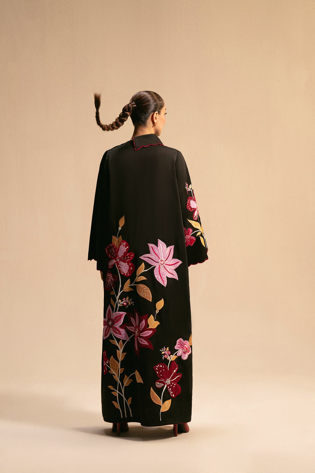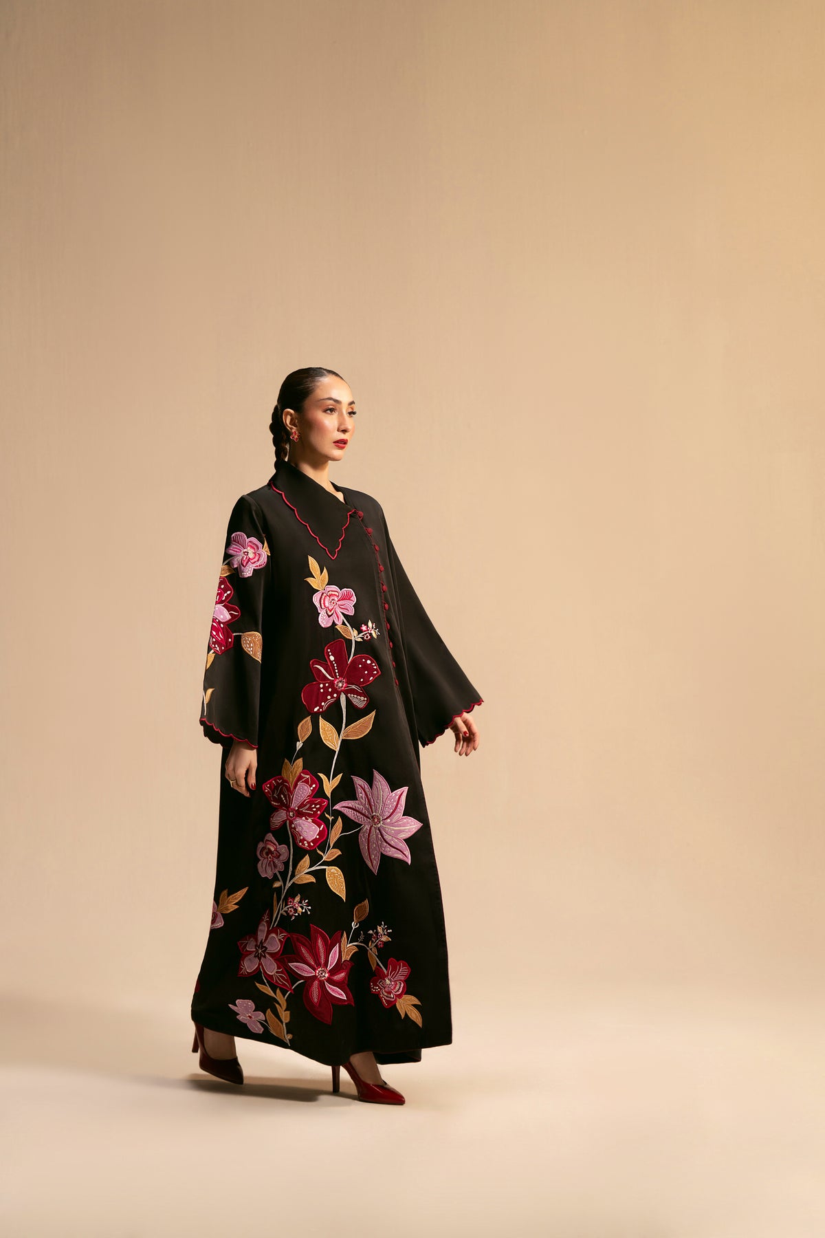 This striking black long dress features a beautifully structured silhouette, elevated with rich floral embroidery in shades of deep red, pink, and gold. The design showcases large, bold flowers placed thoughtfully across the front, back and side adding a luxurious and artistic feel.