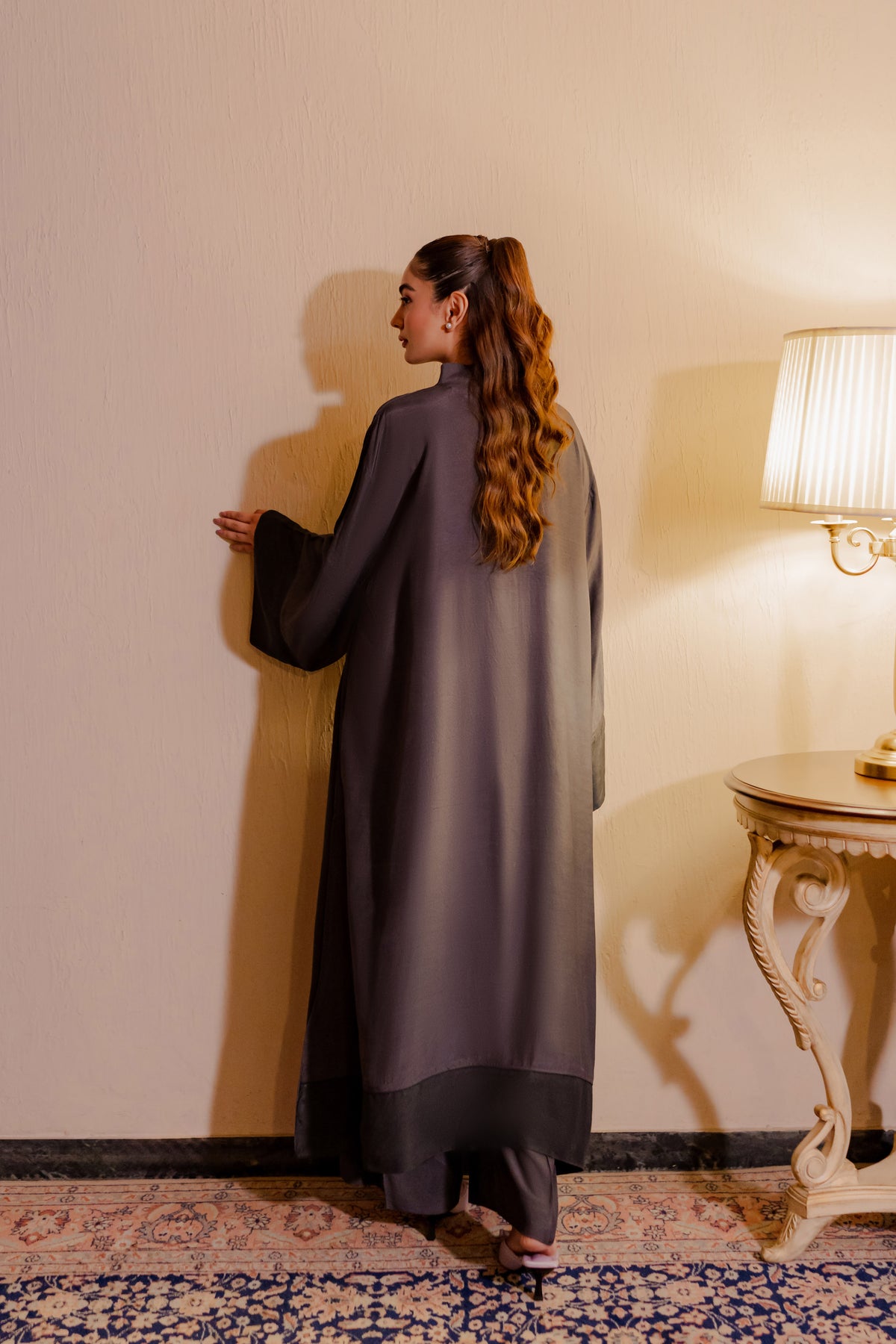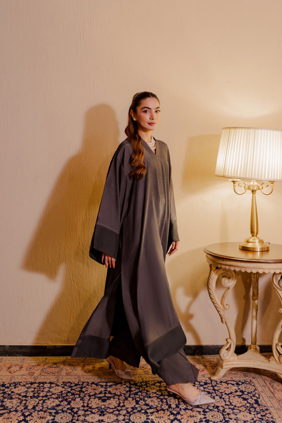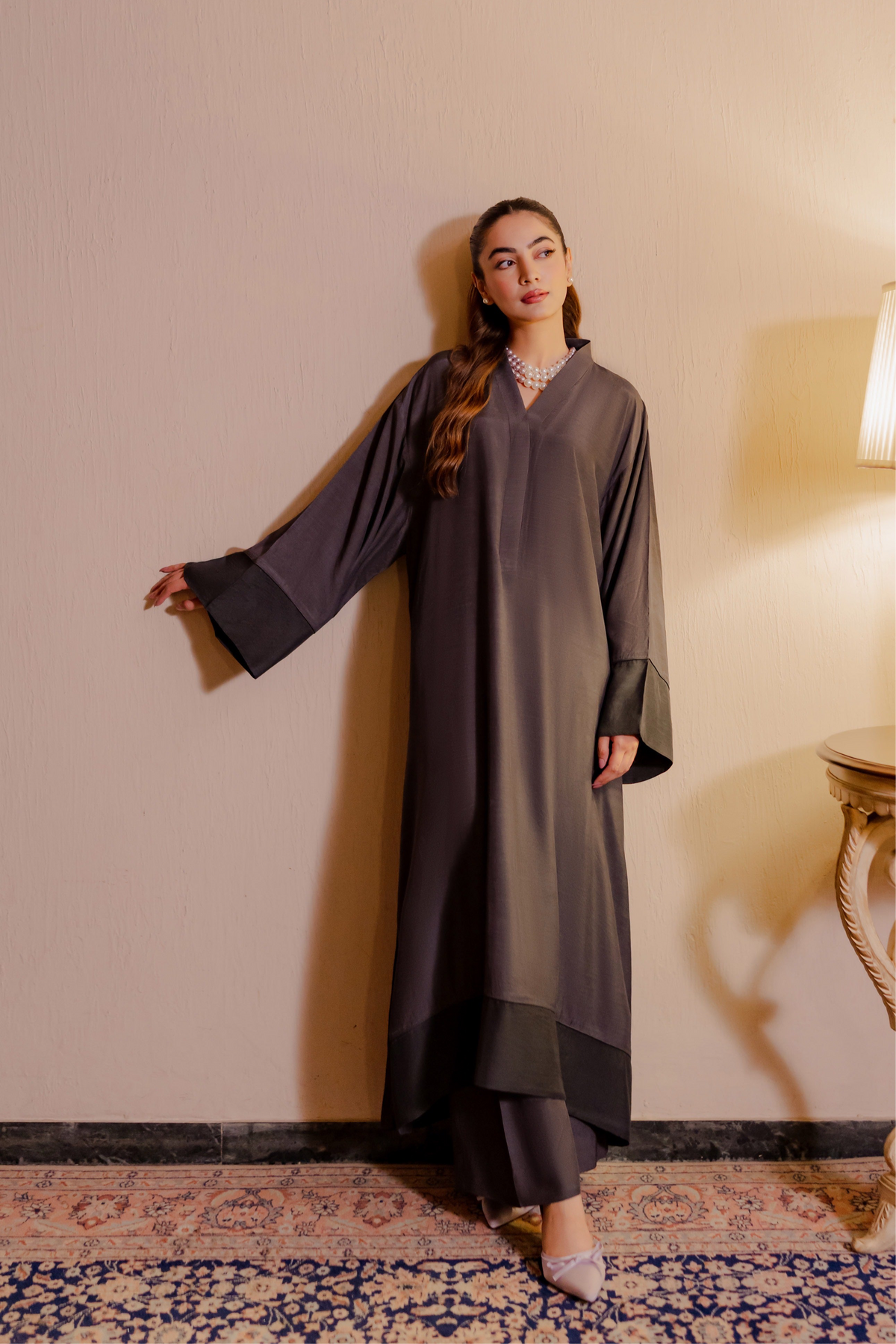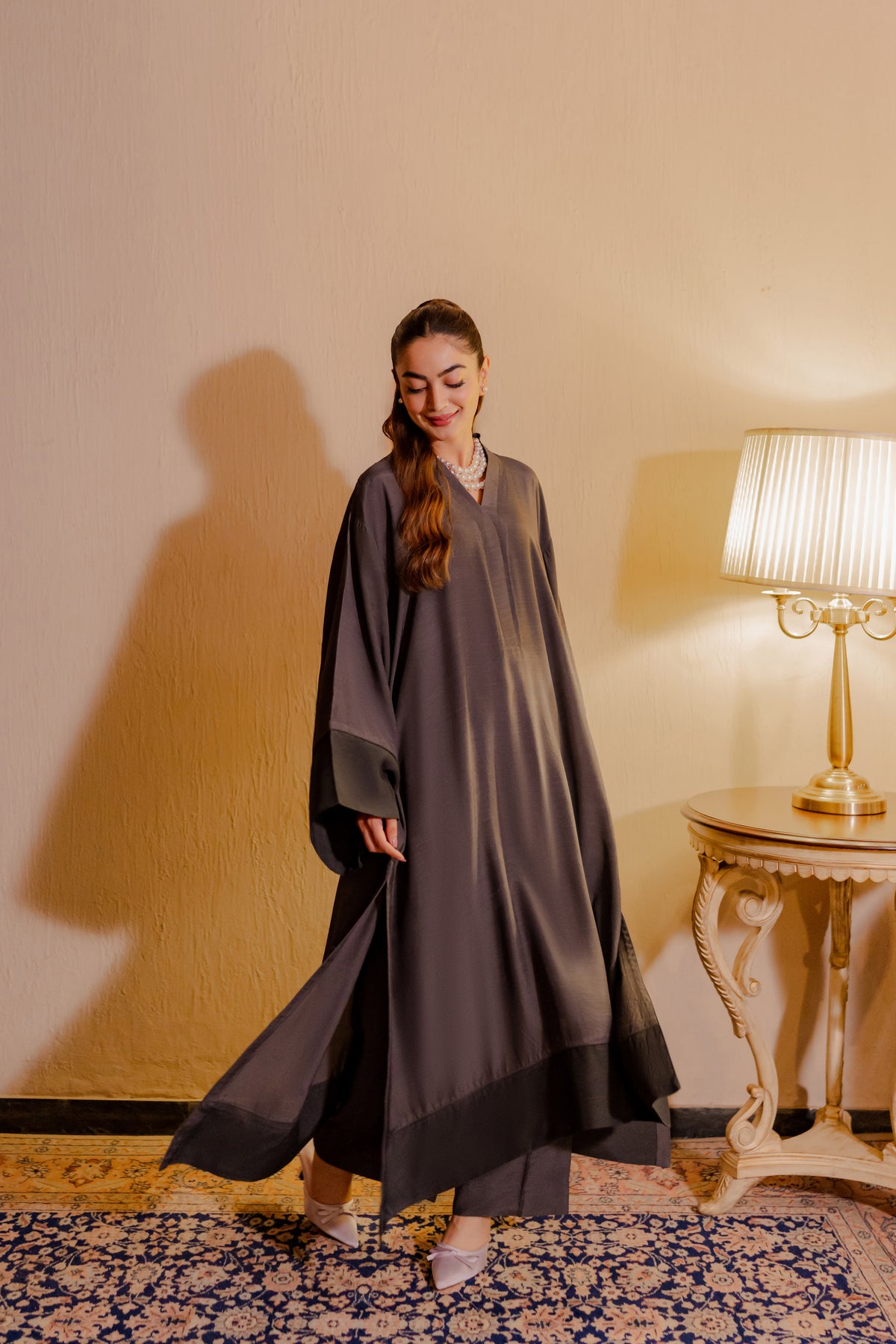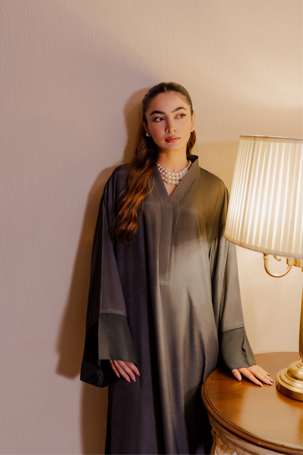 This hot pink kaftan-style dress features a relaxed, flowing silhouette with a straight, floor-length cut that drapes gracefully. It has a clean V-neckline that adds a subtle feminine touch while keeping the look modest.The sleeves are crafted in a wide bell-cut style finished with tonal borders, adding soft detail to the minimalist design.